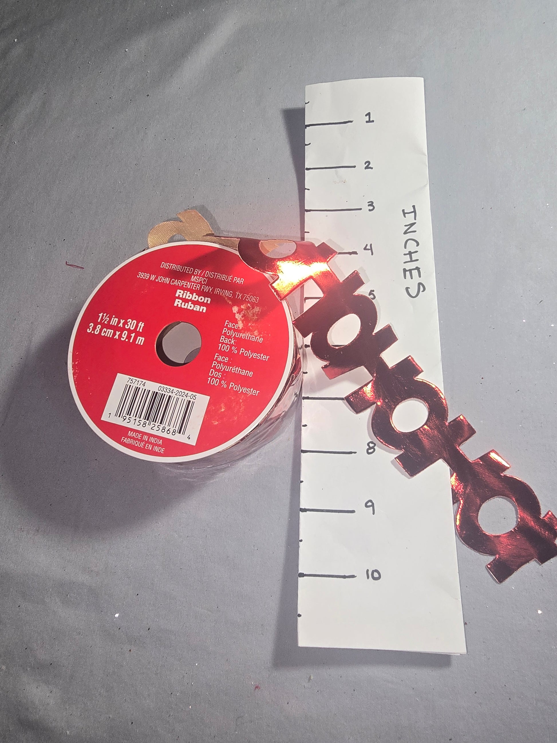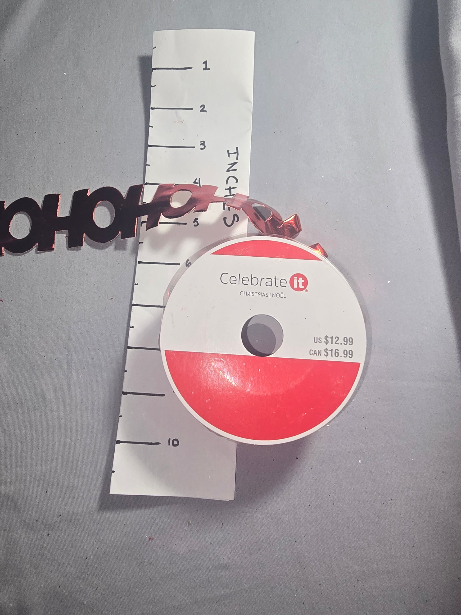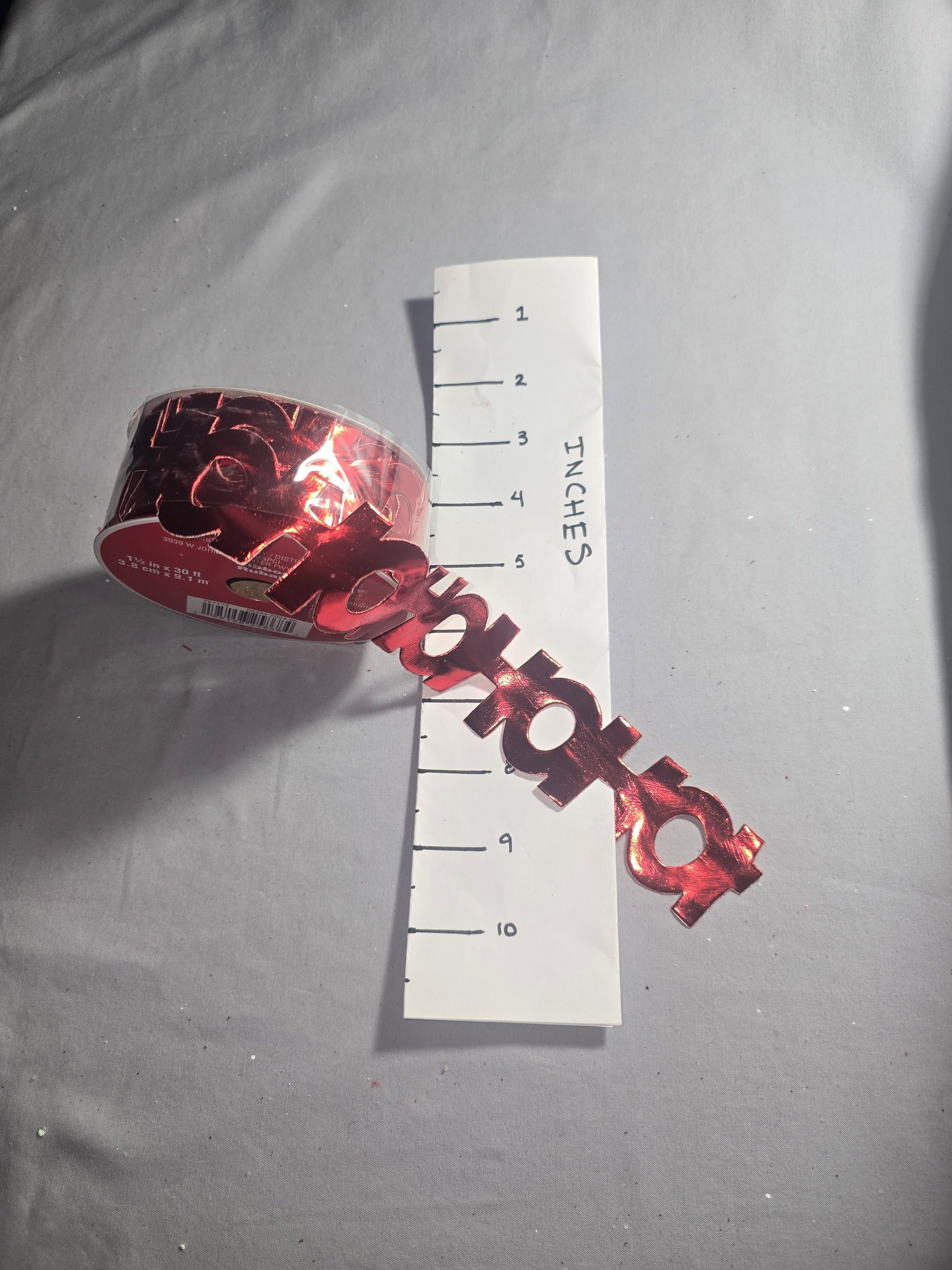 1 1/2 in X 30 ft - red shiny metallic " ho ho ho" cut out (non wired) ribbon